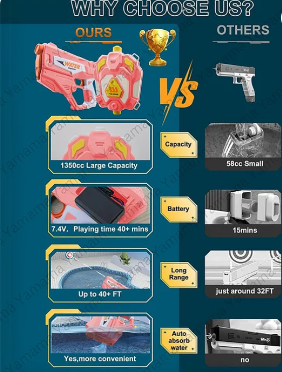 The Yamama Rechargeable Backpack Water Gun is designed for non-stop fun and excitement! With its auto-absorption water feature, refilling is effortless just dip the nozzle into water, and it fills up automatically. This high-pressure water blaster can shoot up to 40 feet, making it perfect for thrilling summer battles. The large 1350ml backpack tank ensures extended play without the need for frequent refills. Built with durable, non-toxic materials, it's safe for kids and adults alike. Whether you're enjoying Holi, a pool party, or outdoor fun, this rechargeable water gun is a must-have for endless entertainment! Automatic & Manual Water Filling option make it suitable for any where .