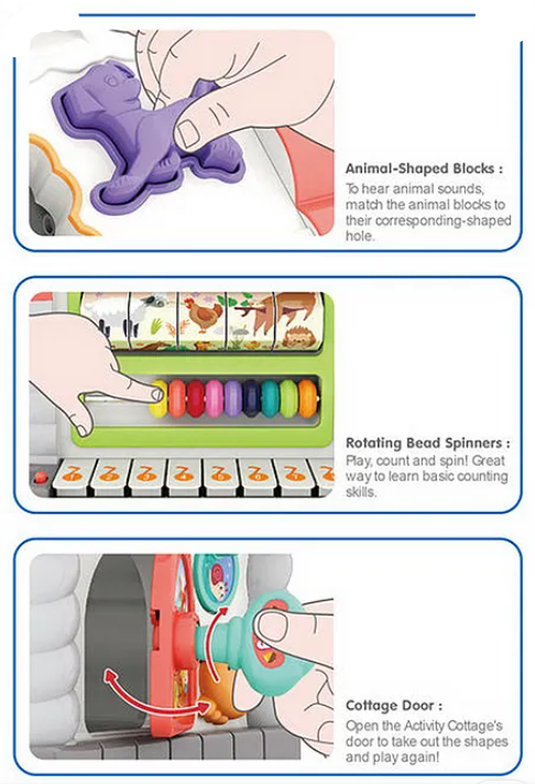 This toy comes equipped with various functions to increase a child's learning ability but as well as their sensory motor interactions. The house comes with a tiny keyboard that plays different key tones when pressed, but with the switch of a button, the mode changes to play songs. Therefore, when one of the 8 keys is pressed down, a different tune will be played that a child can enjoy. On top of the keyboard, there is a row of beads of different colors that can be used to learn to count and learn colors as well. When the house is rotated there is a picture of a dog holding a key that open ups the door to the house! The toy also comes with various shape block holes that teach a child to learn the different shapes and different animals from a farm and their corresponding sound. With the various sounds, the chimney that lights up when a top makes anise, and the multitude of activities, this toy has the capability of providing endless amounts of fun