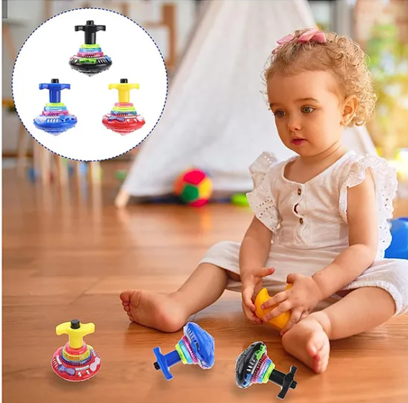 This classic toy will encourage your kids' creativity physics and fine motor skills. You will receive 4 Pack light up spinning tops in assorted colors with launchers. When the top hits the ground, the spinning top will emit colorful flashing light, accompanied by festive music, it will show a better colorful effect in the dark. These light up spinning tops are simple for most people to play, just attach the launcher to the top, twist the handle to tight the spring, then press the trigger and let the ufo spin tops spin, easy to play by little ones as young as 3. ur light up spinning tops are made of quality ABS material with smooth surface, non-toxic and safe for kids. And these ufo spinning tops are durable enough to withstand active play. Please don't over twist or the spinning toys might break. The LED lights can change patterns as it spins, which can make these light up spinning tops a hit at any party. Fun and impressive presents for kids to focus attention and you can accompany your little ones to play this rotating toy to strengthen the bond. Best for dark rooms, as the laser effects will amuse and make your kid child happy. UFO - shaped top with cool led light effects, plus hip - hop style tunes that coordinate rhythmically with the light show. Kids will love these light up spinning tops with colorful flashing and fun sound effect, great for party favors, stocking stuffers, gift bag fillers, giveaways, kids' prizes, school classroom awards, etc.